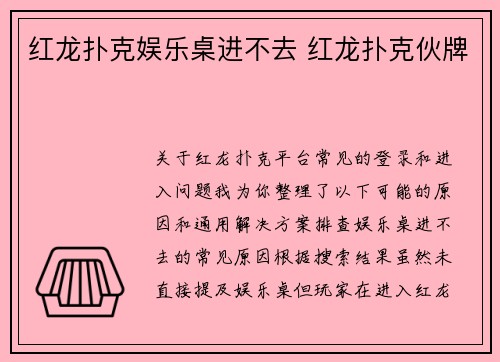 如何下载与安装红龙扑克 | 设备平台 | 关键步骤 | 注意事项 | | :-- | :-- | : | | 安卓设备 | 1. 访问官网下载页面。2. 点击“立即下载”获取安装包。3. 安装时如遇...